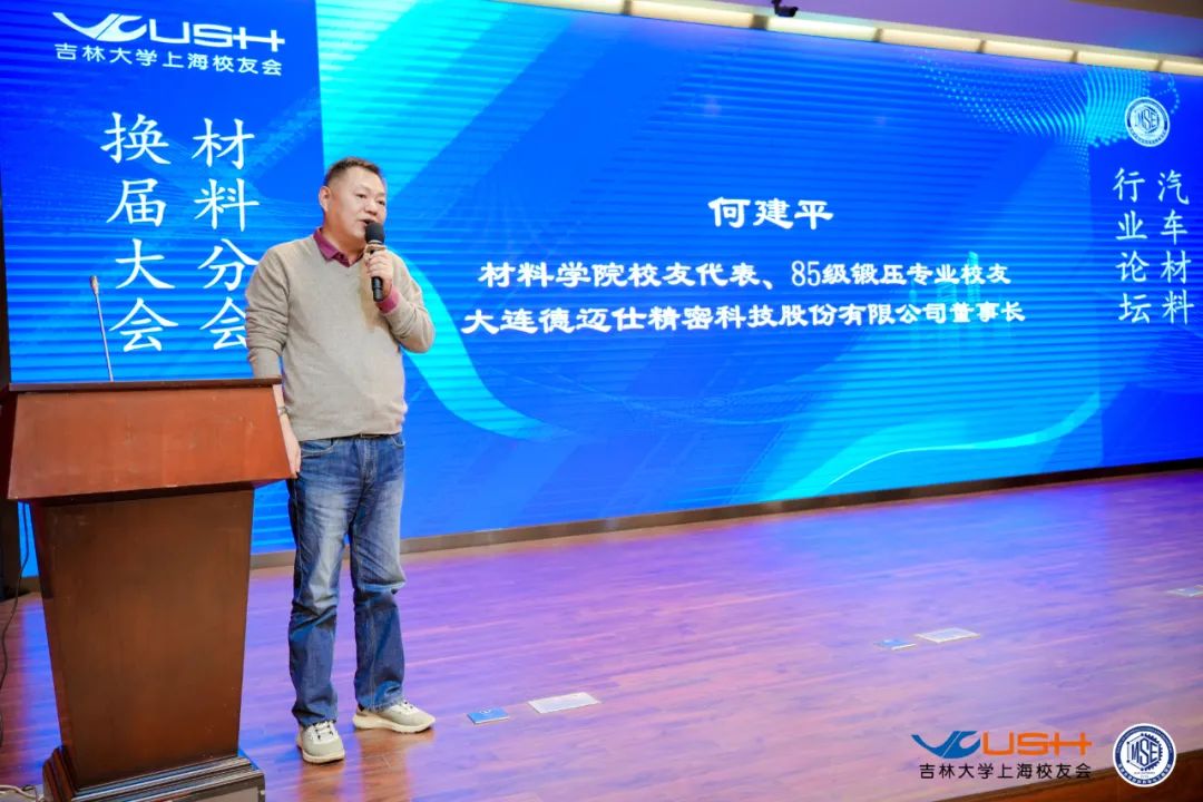 会议第六项,外地来沪校友代表、材料学院锻压85级校友、创业板上市公司大连德迈仕精密科技股份有限公司董事长何建平随后上台发言,他对上海校友会材料分会的成功换届表示祝贺,并祝愿上海校友会及材料分会越办越好!