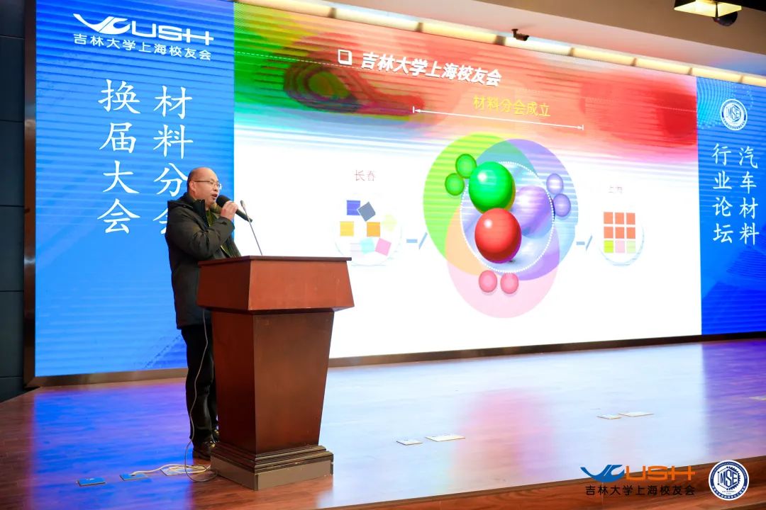 会议第四项,专程到场祝贺本次大会召开的兄弟社团组织代表,上海交通大学材料学院校友会秘书长刘巍和吉大上海校友会计算机分会会长唐海鹰先后登台致辞,都对本次换届大会的成功举办表示祝贺,并表达了今后与吉大上海校友会和材料分会加强交流、紧密合作的意愿。