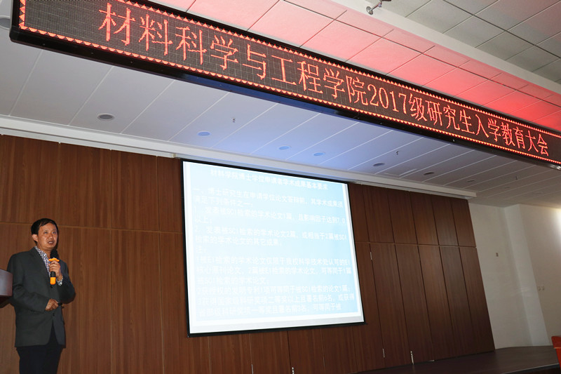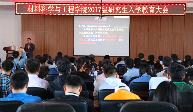 于2017年8月29日上午9:00在逸夫机械材料馆八楼报告厅对全体2017级博士、硕士研究生进行了科学道德与学风教育会议。材料学院党委副书记曲贵文、副院长朱永福、研究生办公室秘书刘徽出席会议。会议由性吧