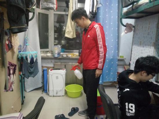 4月8日晚上到13日,生活部部长、副部长与部员分组行动,按照安排流程合理有序地为所有寝室统一喷洒消毒液,并安排各班负责人统一为各个寝室通风,很好地解决了时间少的难题。