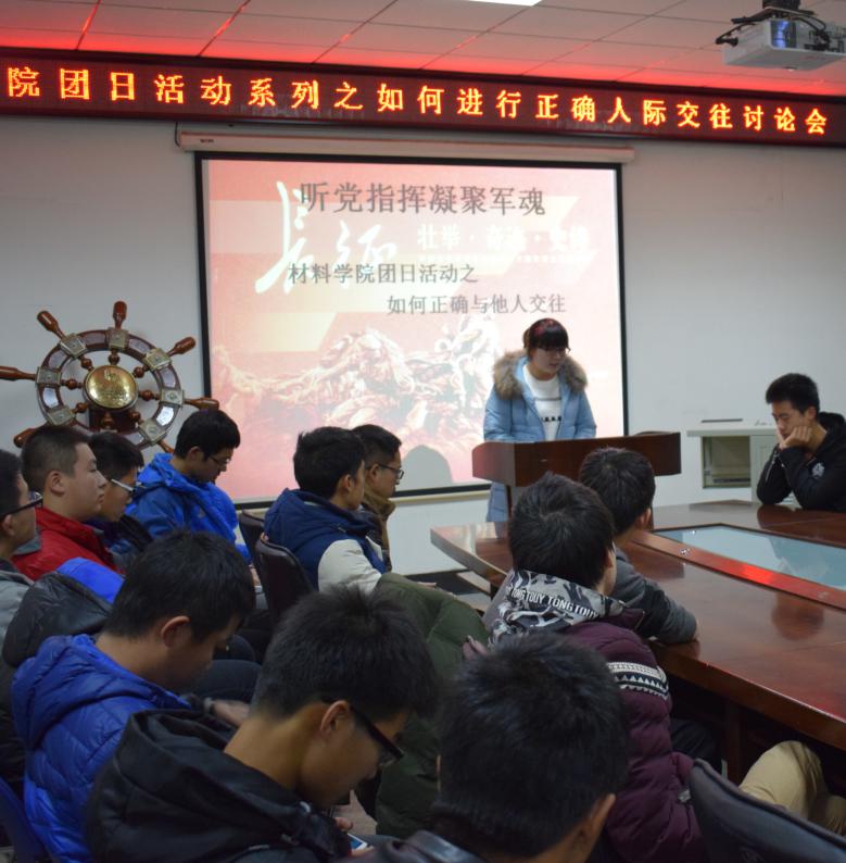 为了使16级学生更好地适应大学生活,成为自信自强的优秀人才,11月11日晚6时,材料学院团委心理健康部在逸夫机械材料馆410室举行了以“大学生如何正确与他人交往”为主题的讨论会。