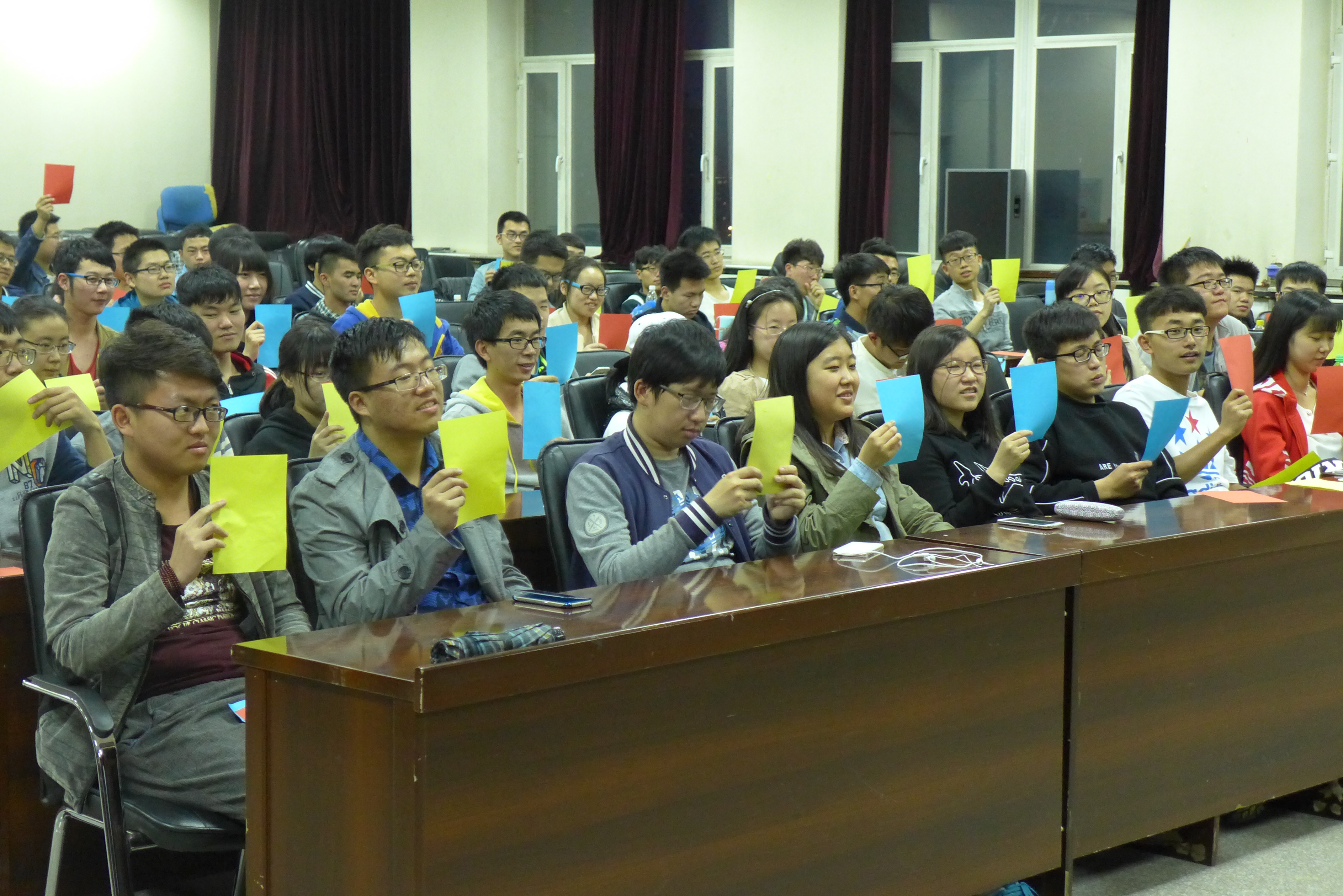 训练一开始,同学们先按原有队形就坐,并复习了上次训练中学习的口号——“材料群雄,气贯长虹,鲲鹏展翅,笑傲苍穹”。这大气铿锵的口号展现出了材料学院学生勇于挑战困难的精神和积极进取的决心。复习过后,同学们用彩纸代替纸扇进行了新的表演内容的训练。学长学姐们将同学们划分成几个小组,各个小组的同学跟着学长的口令以不同顺序举起红、黄、蓝三种颜色的彩纸,再辅以口号相配合,组成了一场完整的表演。一开始,由于部分同学态度散漫没有充分重视训练内容导致整体动作散乱,远远达不到整齐利落的标准,但经过学长学姐们一再强调,观众队伍作为运动会上学院精神面貌象征肩负着的重要责任,渐渐调动起了同学们的积极性与集体荣誉感。接下来,在一次又一次的重复训练中,同学们的动作越来越整齐划一,口号越来越准确娴熟,相信运动会上的表演会因同学们的努力付出而更加精彩纷呈。