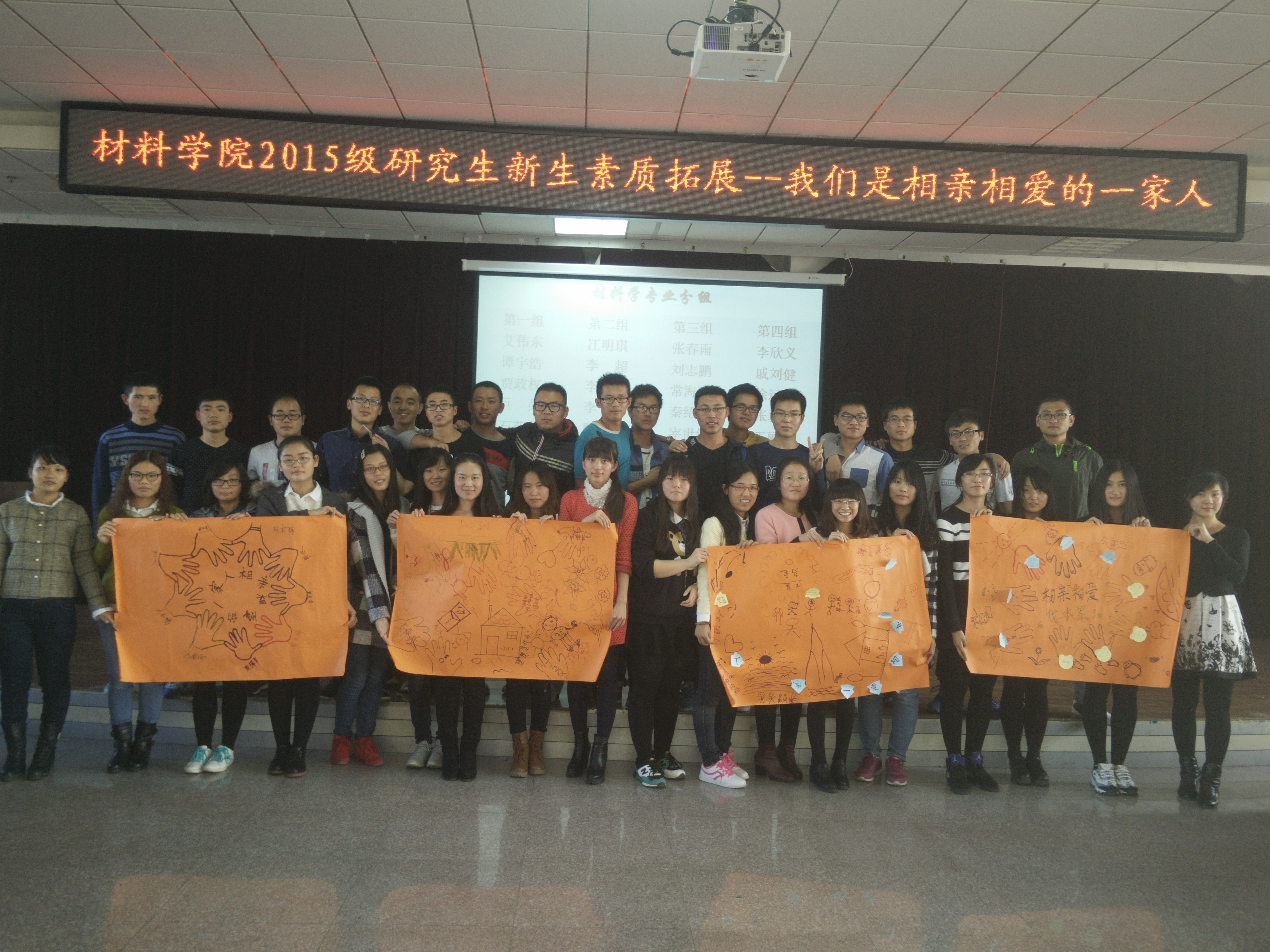 研究生于10月17日-10月18日在南岭校区逸夫机械材料馆八楼会议室举办了主题为“我们是相亲相爱的一家人”2015级新生团体心理辅导活动,本次活动由朋辈心理辅导员以及研究生各班班长共同领导主持,2015级全体研究生新生参加。