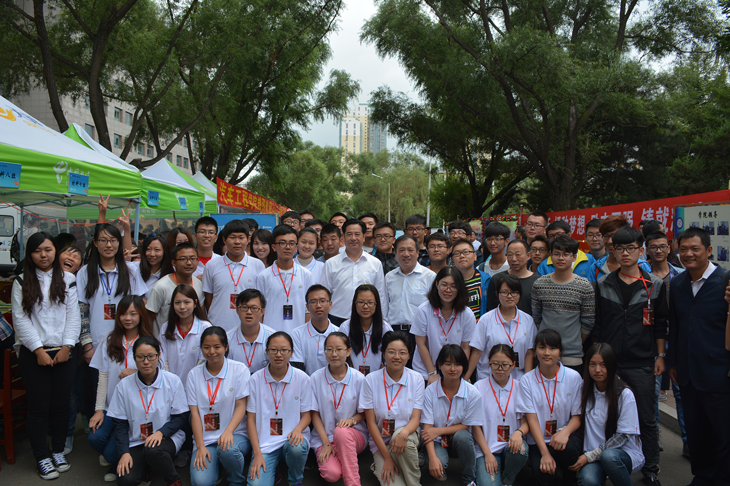 2015级辅导员滕亚廷迎新工作的开展情况,并与新生热切交谈,关切地询问新生家乡近况,是否能适应新的大学生活等问题,鼓励新生在大学里勤学慎思,踏实求是,并以“求实创新,励志图强”的校训寄托对新生的期望。校领导还亲切地问候了在场值班的志愿者们,赞扬志愿者们为学校做出的贡献,期望志愿者们展现出我们吉大学子优良的精神风貌,并同志愿者一一握手。志愿者们受到了极大的鼓舞,以更加饱满的热情投入工作。最后校领导与新生和全体志愿者合影留念,并嘱托志愿者们要认真做好迎新工作。