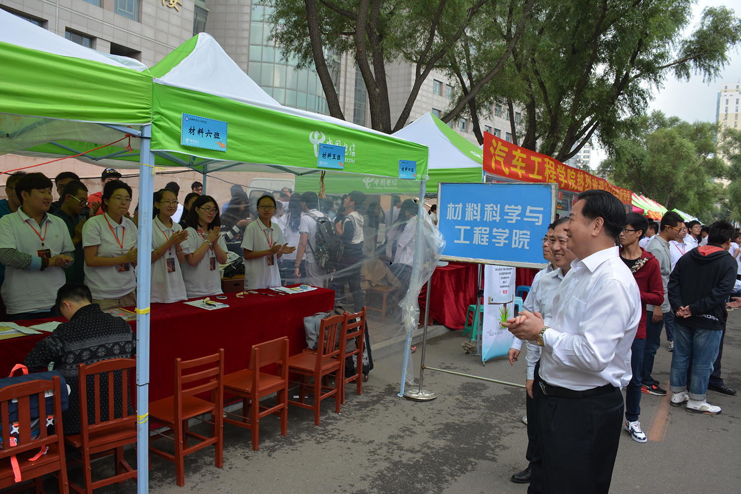 校领导一行人受到了15级新生和在场志愿者们的热烈欢迎。校领导首先询问了性吧