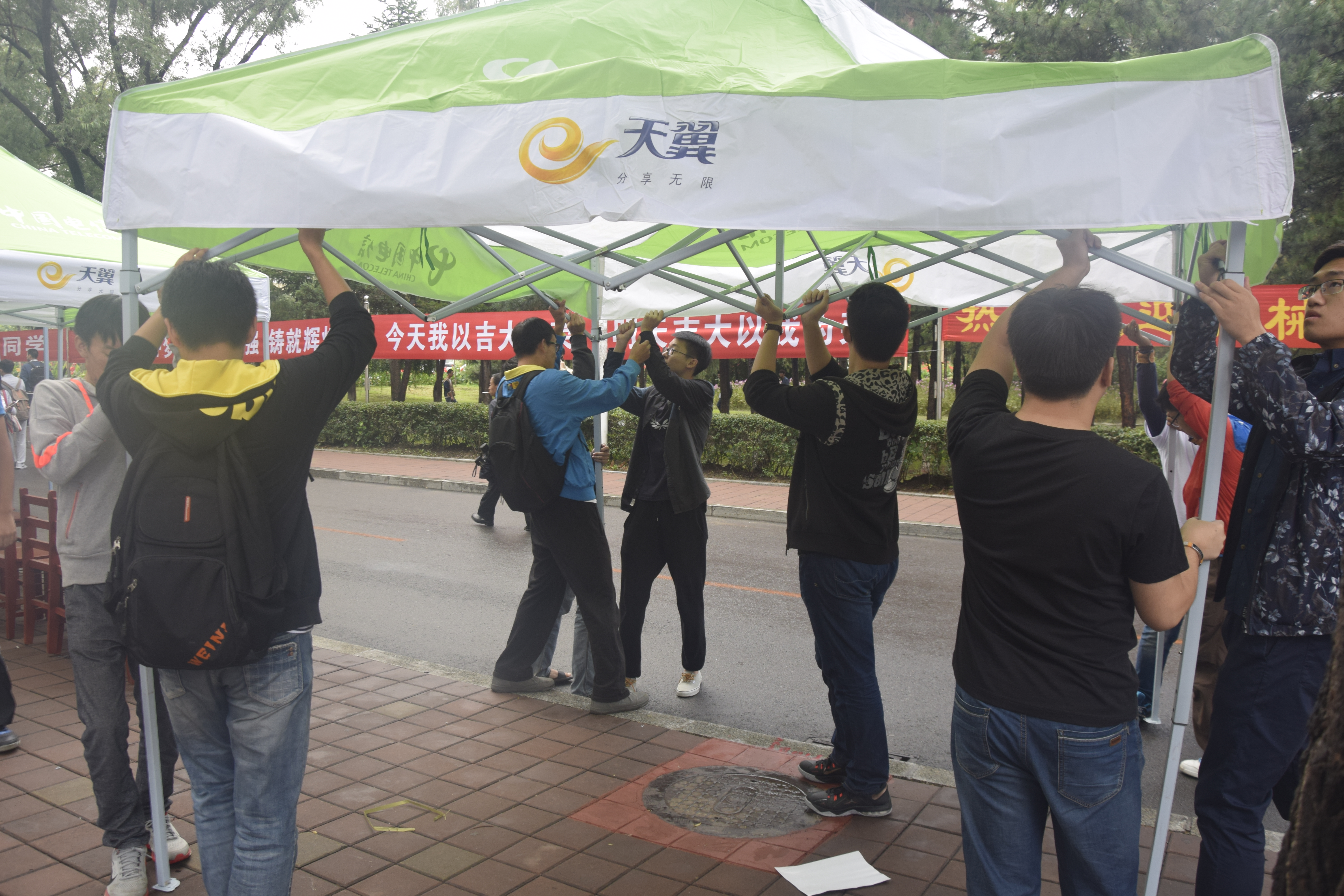 近日来,长春的天气受台风影响,一直阴雨连绵。即便天气情况恶劣,但这丝毫没有影响志愿者们迎新的热情。早上,志愿者们就集聚到材料学院的迎新地点,开始遮雨帐篷的搭建、桌椅的摆放,展板的布置等工作。经过一定的任务分配,筹备工作正式开始。为了未来为期两天的迎新工作顺利进行,同学们工作得认真仔细,短时间内,帐篷就被志愿者们牢固地搭建了起来。帐篷全部搭建好后,志愿者开始桌椅的摆放,并在帐篷上贴好每个班的班牌,方便新生们直接找到自己所在班级,最后志愿者将材料学院的展板送入迎新现场。通过志愿者的密切配合,一切准备工作就绪,迎新接待工作即将开始。