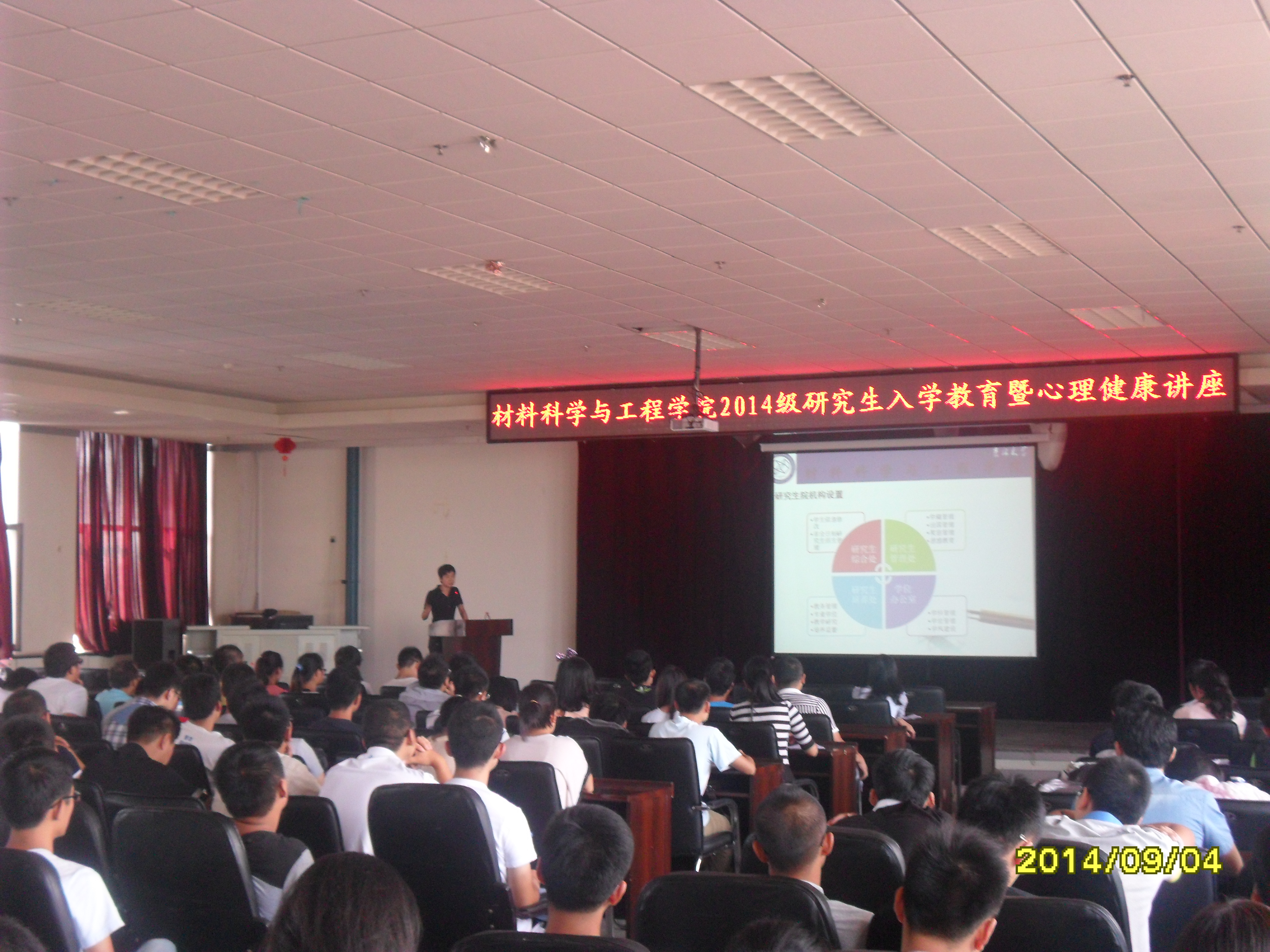 在逸夫机械材料馆举行了研究生入学教育暨心理健康专题讲座。材料学院党委副书记于雅琳老师主持了本次讲座,研究生办公室秘书刘徽老师及2014级全体硕士、博士研究生参加了本次讲座。