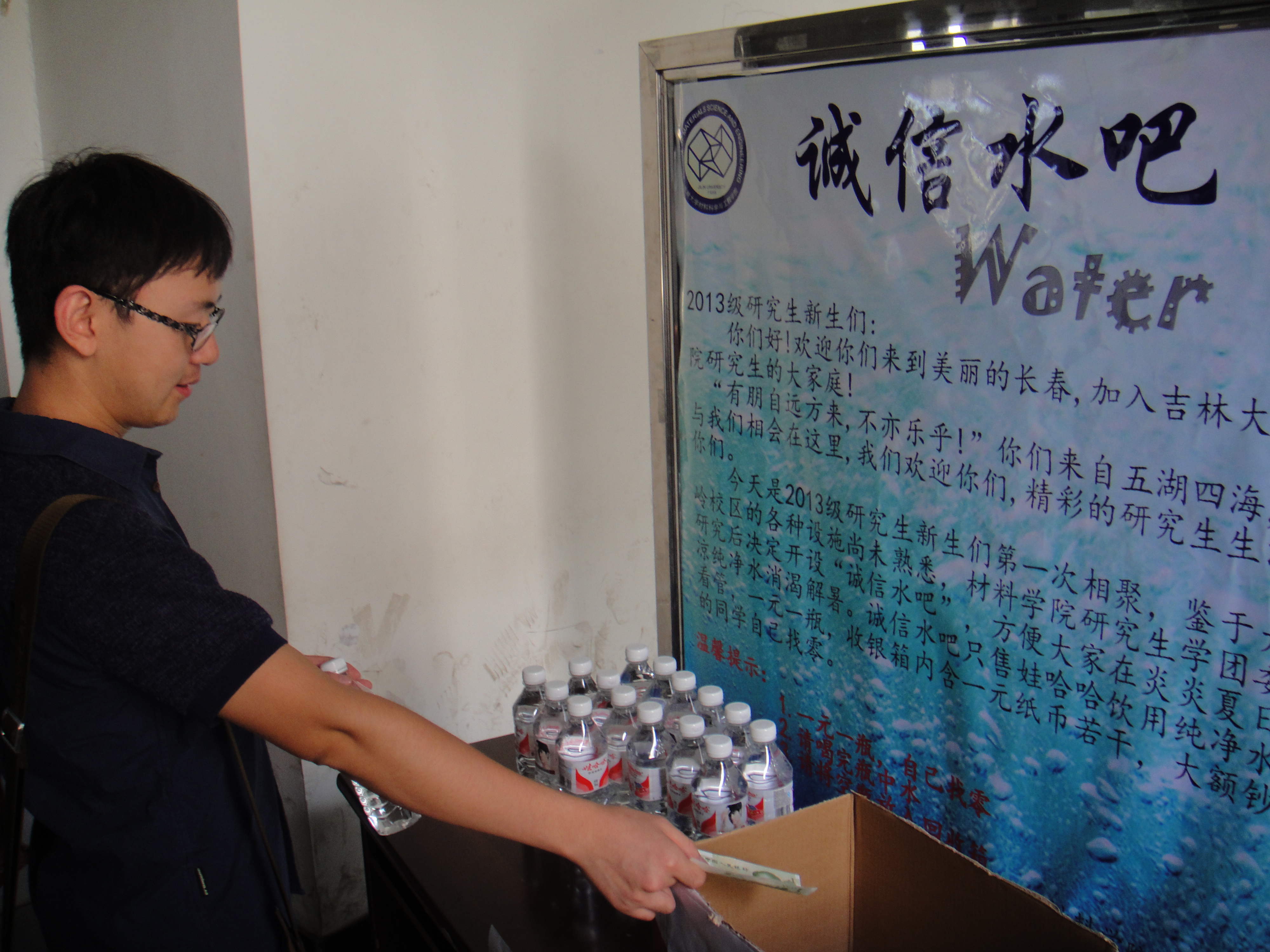 在本次会议进行之前,研究生学团委特意设置了诚信水吧,大家自己买水,自己找零,以这种独特的方式呼吁大家从自身做起,诚信为人,诚信一生。本次学术道德和学风建设专题教育,使大家更加深刻的体会了诚实守信的重要性,相信通过本次专题教育,大家一定能够更好的学习和科学研究,材料学院也一定能够向着更高的目标而不断前进。