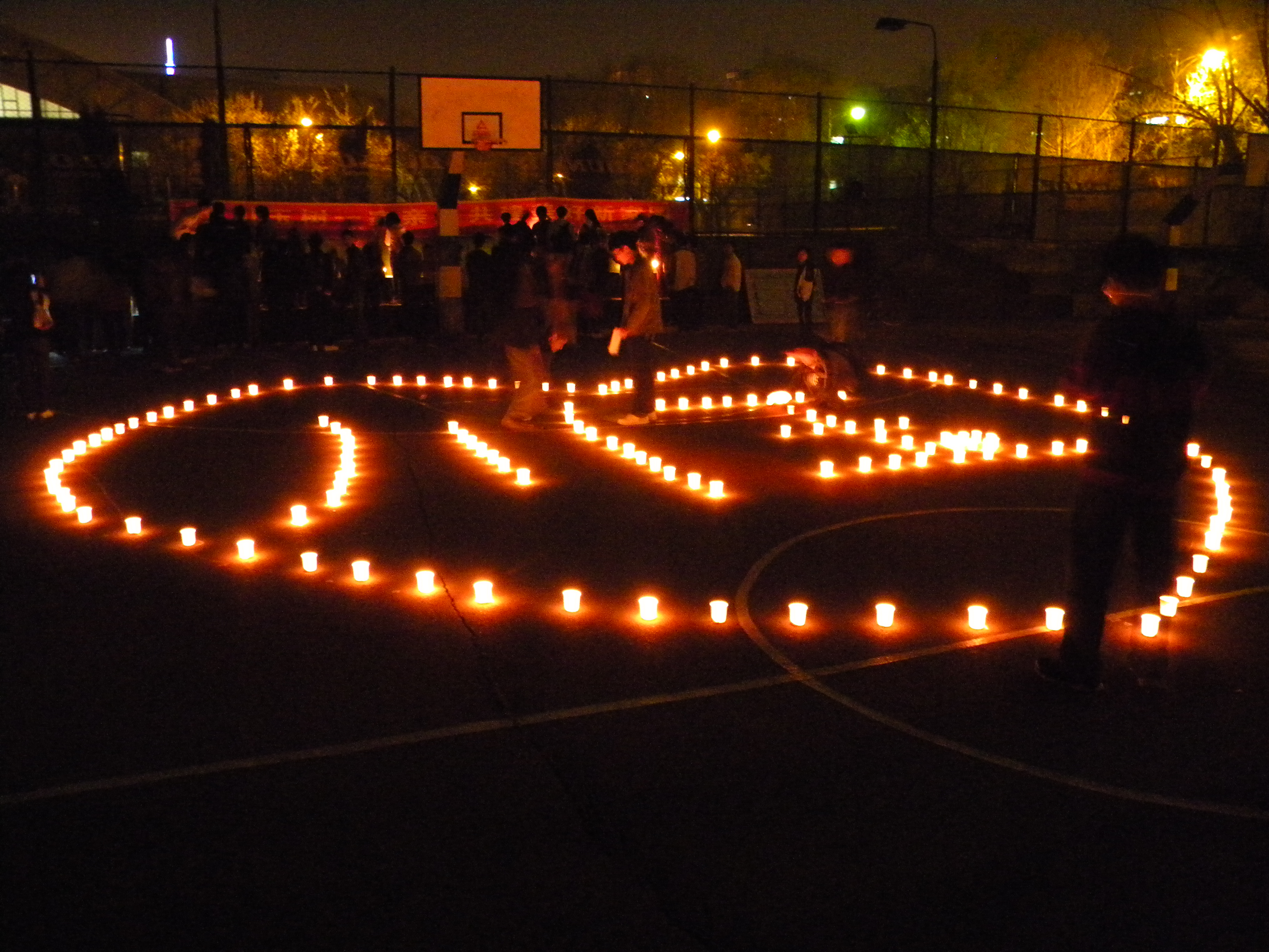 5月13日晚,在南岭校区篮球场举办了烛光祈福仪式。组织方先将“爱心”中的“川、玉”两字点亮,然后同学们为在地震中逝去的灵魂默哀三分钟,接着伴随一首《从汶川到玉树》的诗歌朗诵,大家以传递火源的方式一起将“爱心”点燃。最后,参与此次烛光祈福仪式的同学们一同演唱了《明天会更好》,并纷纷在寄语栏上写下对汶川和玉树灾区的祝福,寄予灾区重建的美好憧憬。