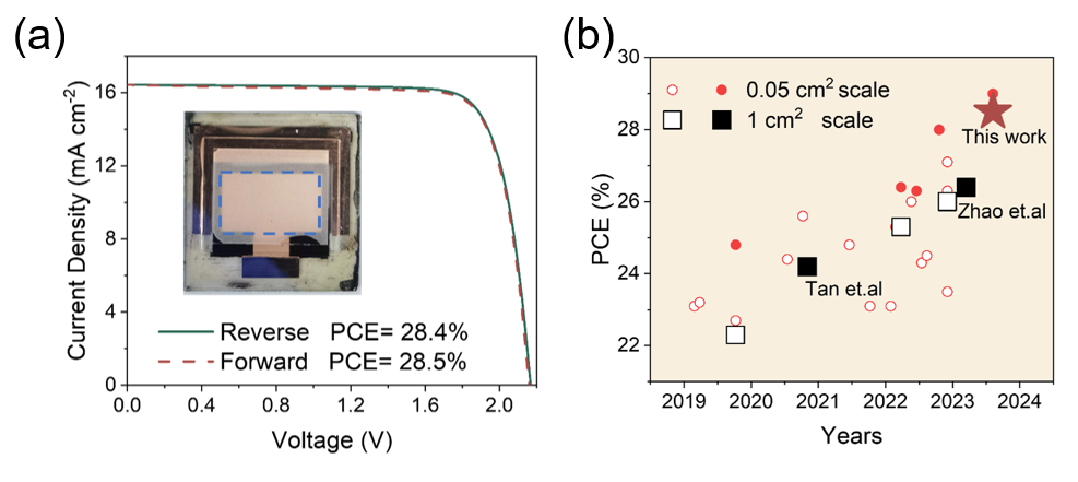 基于这种优化后的电子传输层的宽带隙单结器件实现了最高20.5%的光电转化效率,进一步合成的1.05 cm2全钙钛矿叠层太阳能电池器件实现了高达28.2%的认证光电转换效率(图3a)。此效率为目前该尺寸下全钙钛矿叠层电池的当前世界最高效率(图3b),有望进一步促进全钙钛矿叠层太阳能电池的产业化进程。相关结果已被收录到国际权威的太阳能电池世界纪录效率表《Solar cell efficiency tables》中。