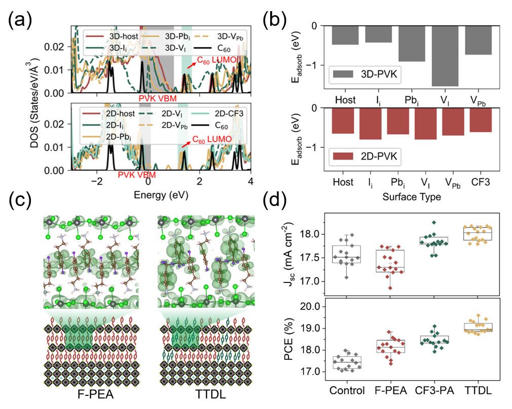 合作团队通过原子尺度的第一性原理材料模拟揭示了TTDL改善电子传输界面均匀性与优化电子传输的机理。在均匀性优化方面,二维钙钛矿层可以屏蔽三维钙钛矿中不同缺陷类型导致的与C60界面的能级对齐紊乱(图2a);并且在与C60吸附方面也表现出相对三维钙钛矿波动更小的吸附能(图2b)。在电子传输优化方面,CF3-PA的引入可以明显改善基于F-PEA的二维钙钛矿面外方向导带边缘附近电子态的分布,实现电子维度调控,提升电荷连通性(图2c),进而显著改善由于二维钙钛矿层引入导致的短路电流抑制(图2d)。