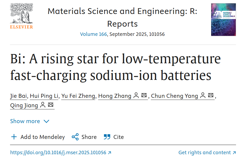 蒋青、杨春成教授团队系统评述了铋基材料作为高性能低温快充钠离子电池负极的研究进展、面临挑战及未来发展方向,为开发适用于极端环境的下一代储能器件提供了重要理论支撑和设计思路。相关研究成果以“Bi: A rising star for low-temperature fast-charging sodium-ion batteries”为题,于2025年6月20日在线发表于《Materials Science and Engineering: R: Reports》。