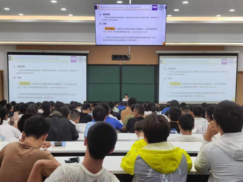 杨淞老师首先介绍了学院外事工作概况,并对近几年本科生参与国际交流和出国深造数据进行基本的梳理和分析,随后详细解读了“英国曼彻斯特大学本科生双学位2+2、2+3、3+2联合培养项目”、“新加坡国立大学本科生 “3+1+1”、“瑞典林雪平大学本科生3+1+1联合培养项目”、“德国亚琛工业大学4+2项目”等目前学院的国际交流合作项目,并对报名条件、选拔资格、费用、毕业去向等进行详细介绍,并细致耐心的回答了同学们提出的相关问题。