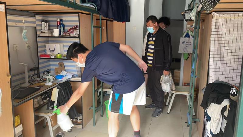 下午15:00时,学生党员志愿者在辅导员老师的带领下,来到十一公寓四楼男生寝室、十二公寓A区四楼女生寝室,对全年级寝室大清扫情况进行检查,并通过工作交流群进行检查情况的通报和沟通;同时,按照校医院老师的具体指导,开展预防性消杀工作。