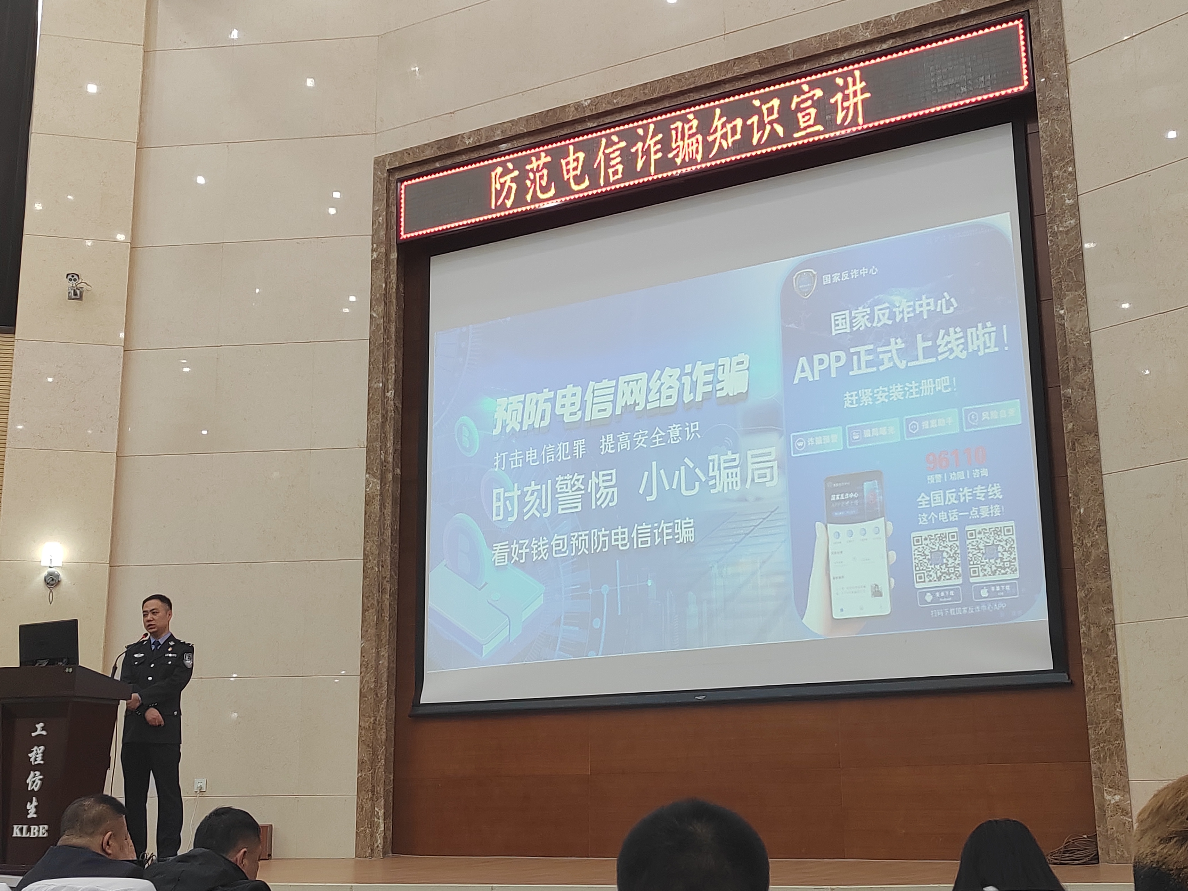 在防范电信诈骗知识宣讲中,警官用通俗易懂的语言和易于接受的视频等形式,讲述了电信网络诈骗的特点,特别是针对大学生常见的诈骗手法,分享了典型的诈骗事例,讲解了防诈骗的知识与技巧,深度剖析了遭遇电信诈骗后给受害人带来的巨大伤害,并提醒同学们遭遇电信网络诈骗时应该采取的各种措施和正确处置流程。