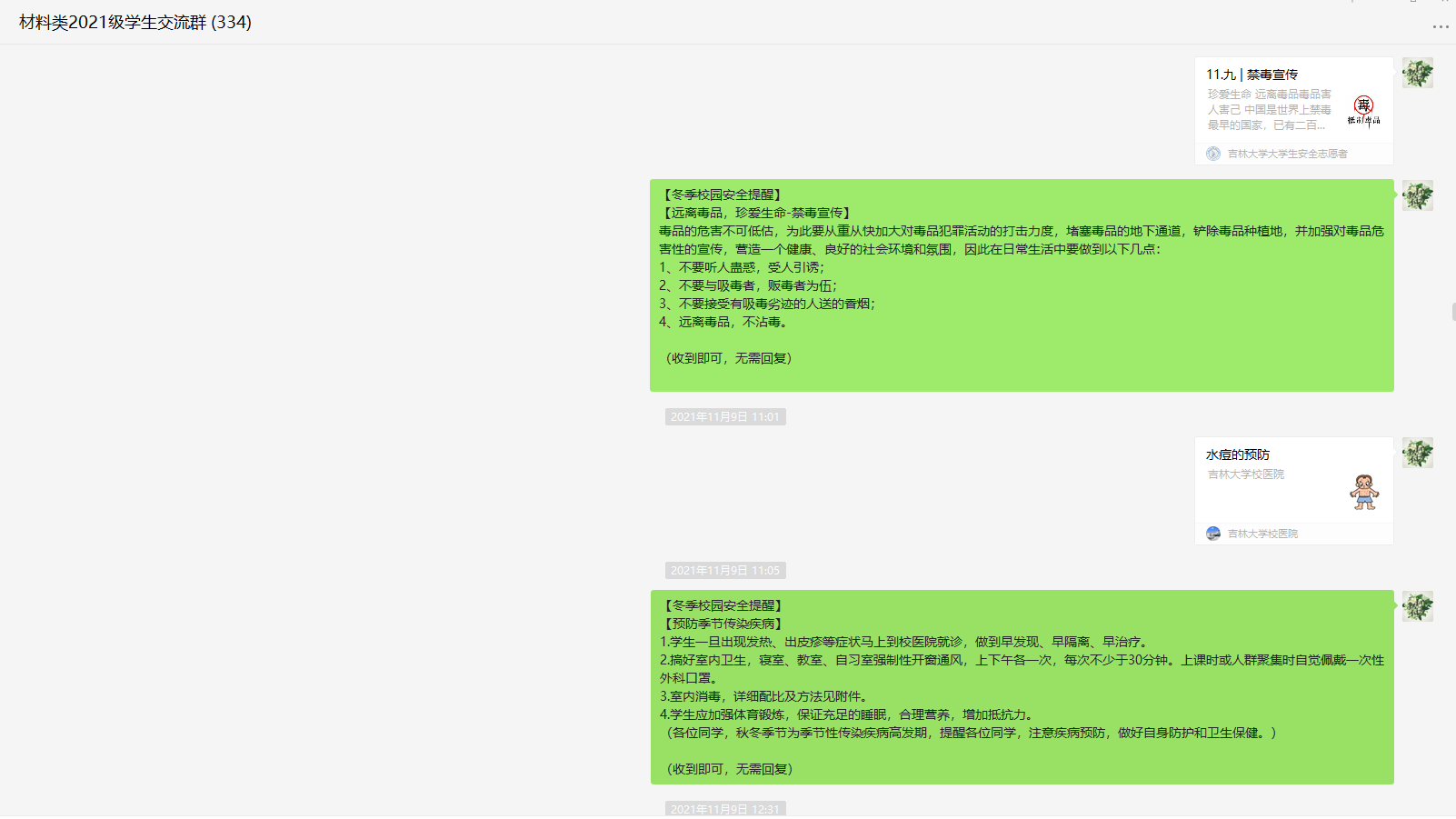 2021级新生入学教育工作方案》等相关工作要求,为更好地落实校园安全教育,在辅导员严冬老师的组织和带领下,2021级材料类学生积极参与到本次活动中。本次活动分为消防实际疏散演练、校园违章电器展示、禁毒宣传、防电信诈骗、交通安全、国家安全等六个活动板块,2021级材料类学生参加到全部六个板块的活动中,对“校园安全”这一核心主题有了更深刻的理解。与此同时,辅导员严冬老师面向2021级材料类全体新生同学开展线上主题安全教育,有效的防范了校园安全风险。
