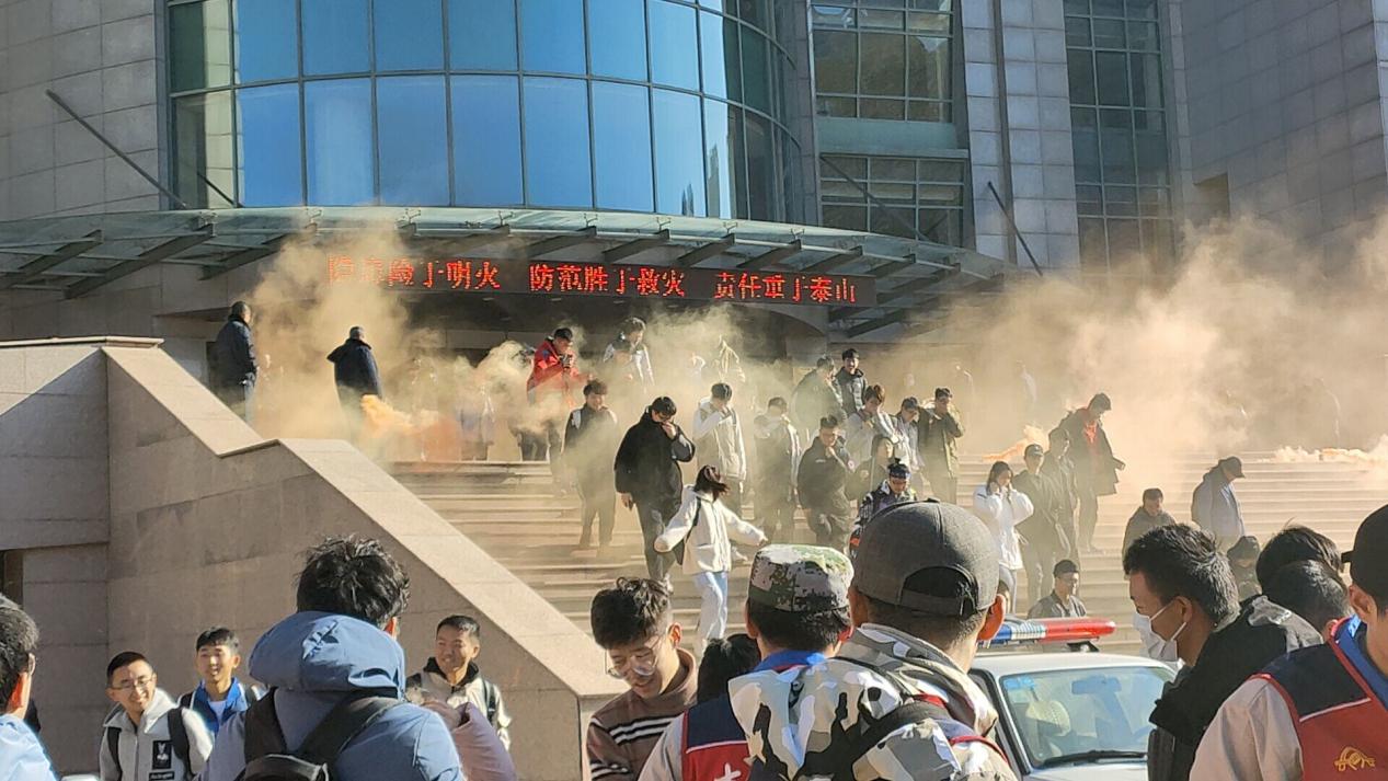 本次活动是由南岭校区各学院及相关单位联合开展。活动开始前十分钟相关工作人员打开逸夫教育大楼一楼所有安全通道,电梯运营商停运所有电梯,为活动开展提供了安全保障。9日上午11:40活动准时开始,逸夫教育大楼各个楼层弥漫着提前准备的发烟装置散发的模拟浓烟,警报声中,疏散组织人员组织上课以及自习的学生掩护口鼻紧张有序地从各个安全出口快速逃生。随后,从出口疏散的同学集中于逸夫教育大楼前的展板宣传场地,由性吧