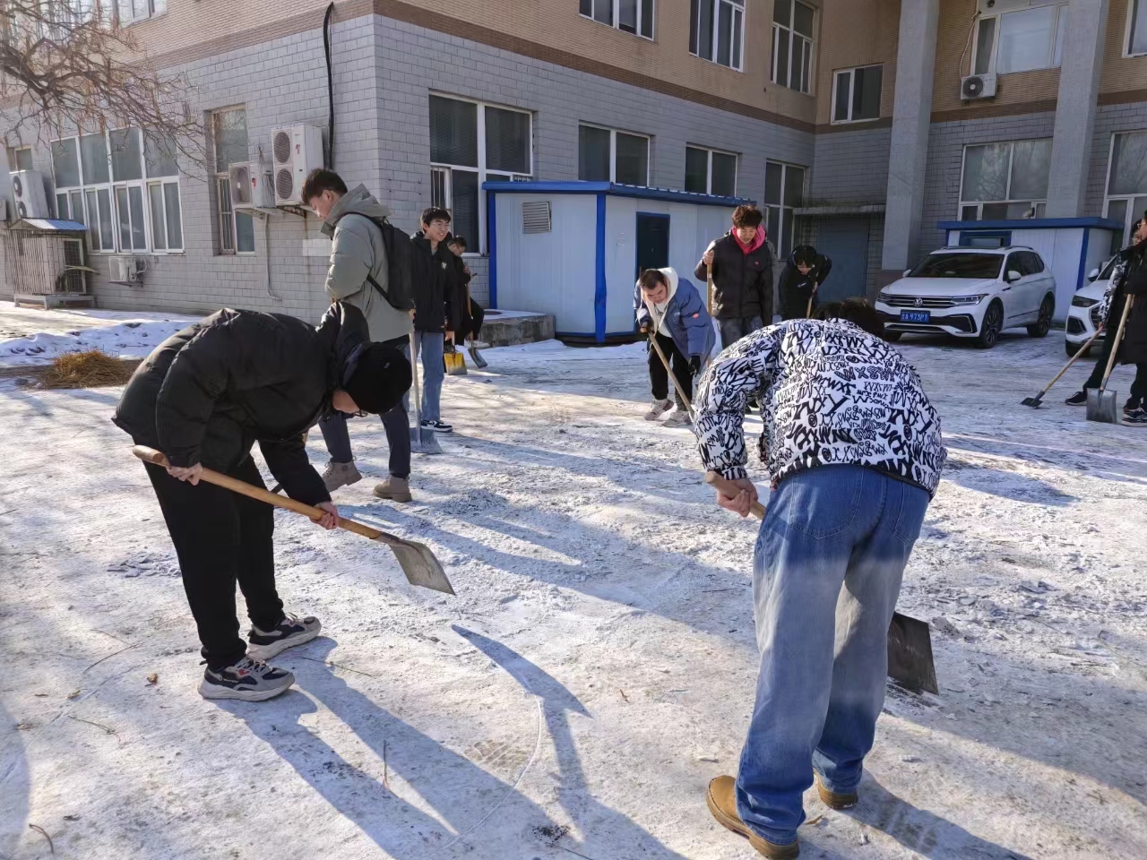 同学们拿着铁锹等扫雪工具,有条不紊、目的明确地清理着路面积雪。大家本着不怕苦,不怕累的精神,工作认真而高效,用自己的行动,展现了大学生的责任和担当,为校园的秩序和安全贡献了自己的力量。