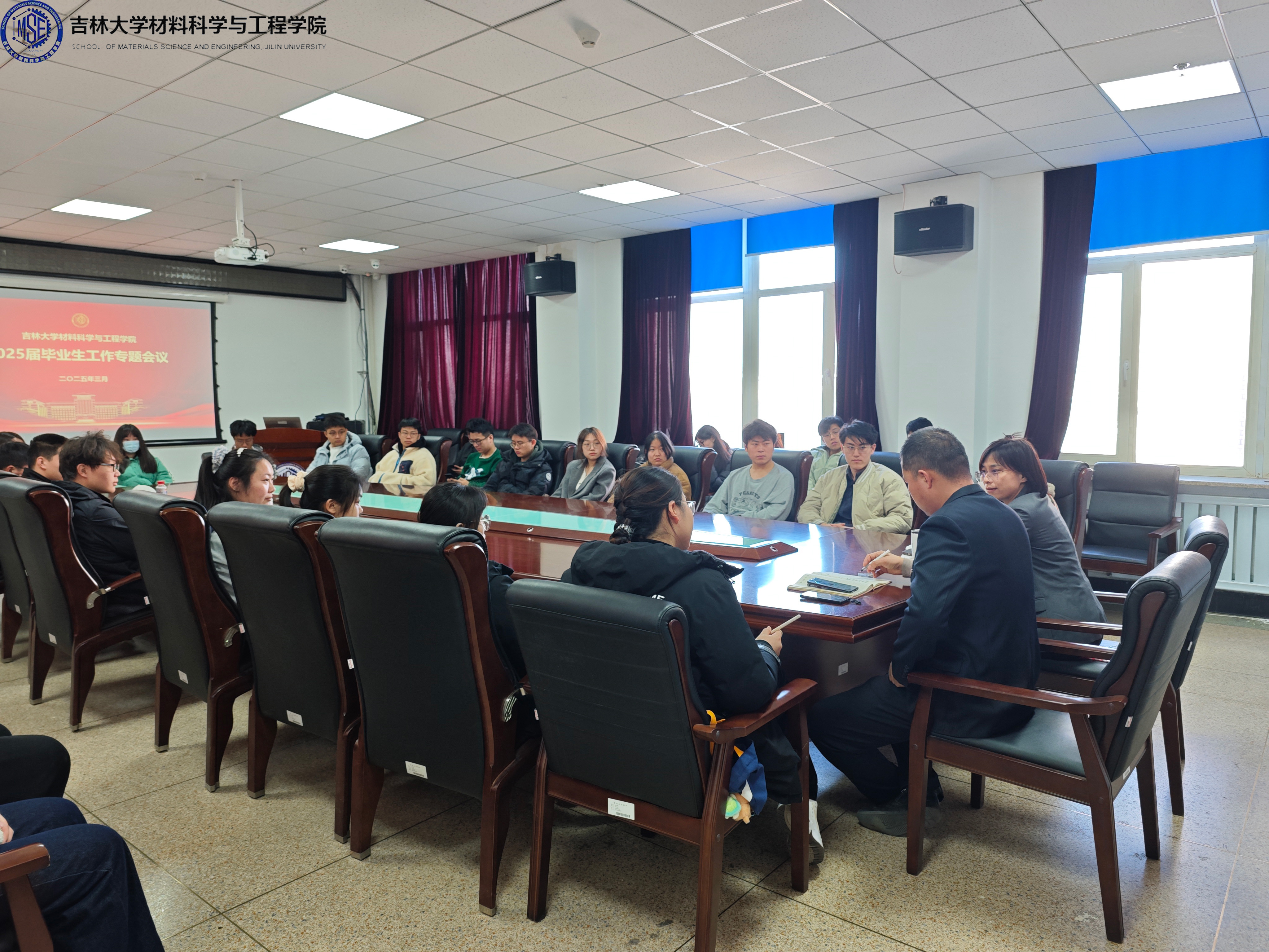 于2025年3月13日中午在南岭校区逸夫机械材料馆410会议室召开毕业生工作专题会议,学院党委副书记兼副院长华蕊老师、学院本科毕业班辅导员严冬老师,南岭校区2021级各行政班班长、团支书,以及2021级各教学班负责人参加了本次会议。
