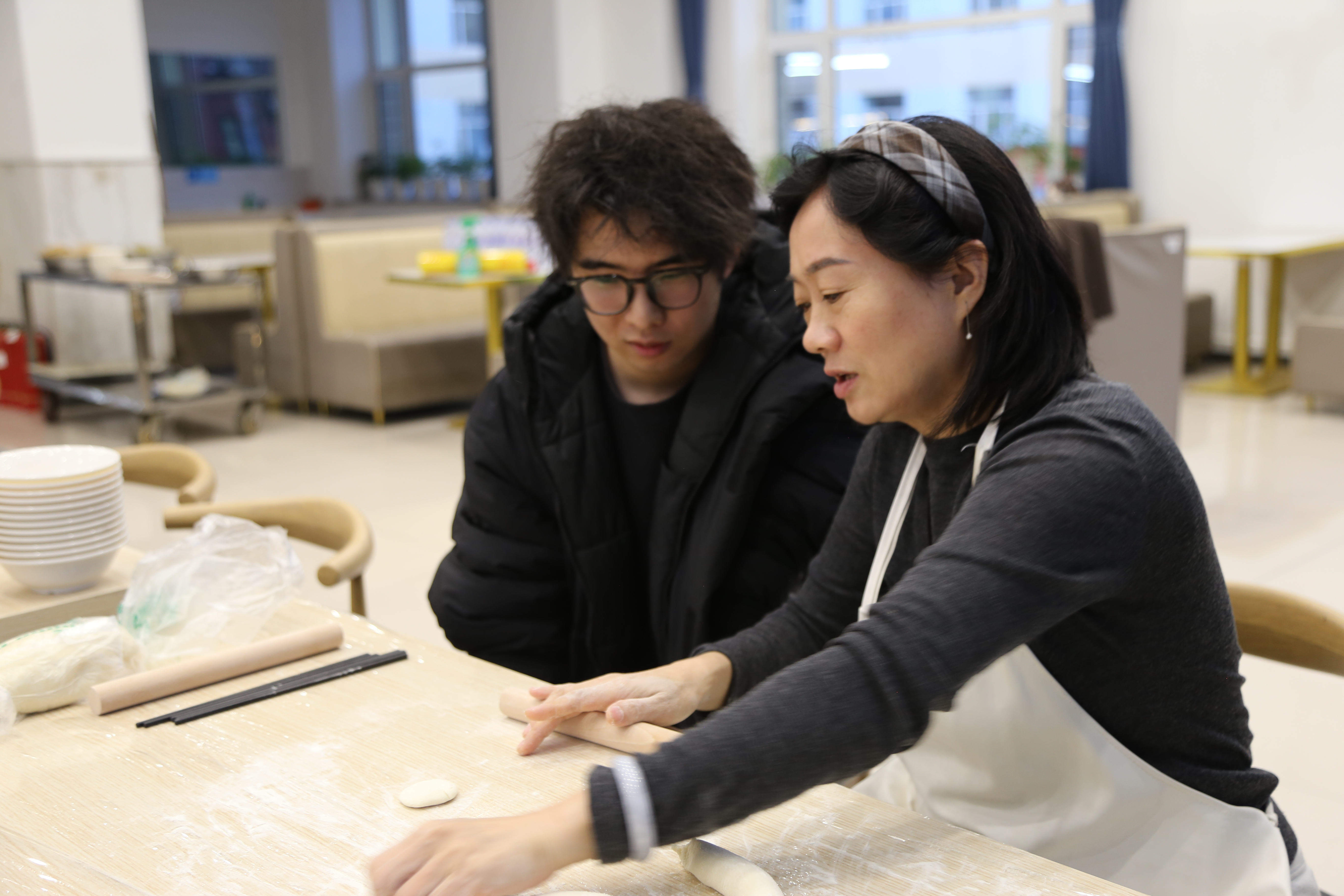 在包饺子环节中,同学们分工协作,揉面、擀皮、包馅、摆盘,形成了一条高效的“合作链”。具备经验的同学主动担任“技术指导”,耐心示范;初次尝试的同学积极学习,从生疏到熟练,在劳动中体验到成就感和团队归属感。材料学院徐虹老师也亲临现场,与同学们亲切交流,给予鼓励和指导,进一步增强了活动的教育意义和心理支持作用。