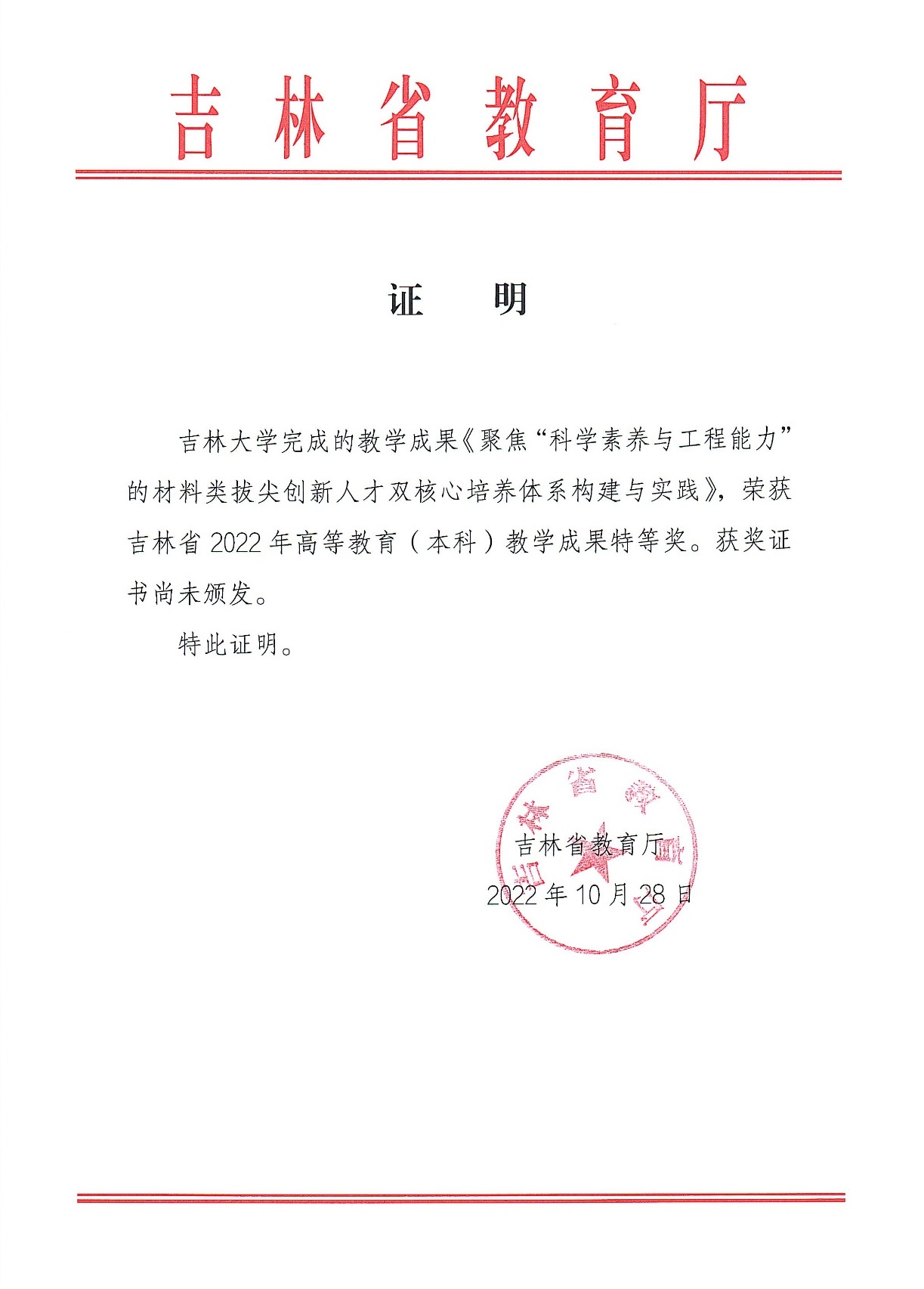 吉林省2022年高等教育(本科)教学成果特等奖:《聚焦“科学素养与工程能力”的材料类拔尖创新人才双核心培养体系构建与实践》,吉林省教育厅,2022.10.28