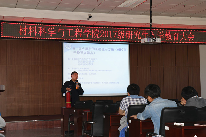 于2017年8月31日上午8:30在逸夫机械材料馆八楼报告厅开展了2017级研究生新生安全教育的专题讲座,本次讲座由东区保卫办公室消防科科长韩旭和东区综合办治安科科长于珺分别对消防安全、综合治安两个较为突出的问题进行细致讲解。