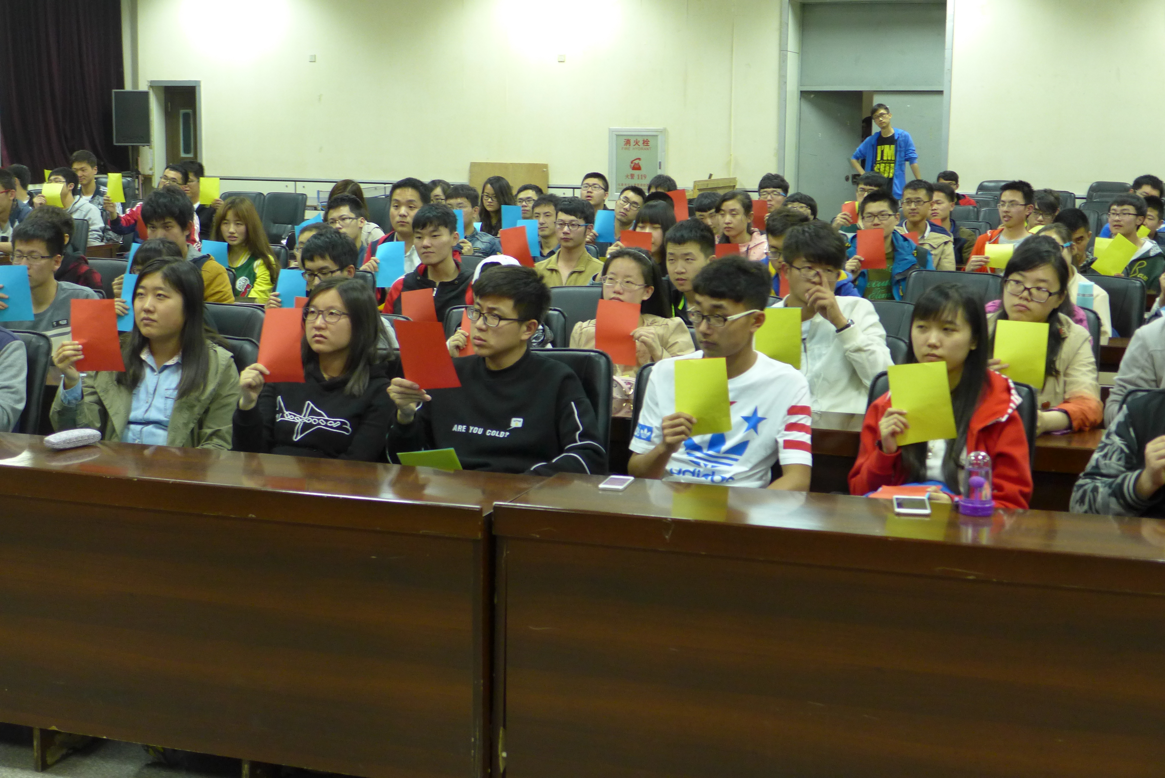 排练于晚8:30正式开始,几位团委副书记首先向大家交代了运动会当天观众啦啦队的活动流程安排、应带物品及运动会当天的注意事项。在确定了最终人选后,几位负责人着重地对队形进行了安排,包括手持三色变色扇子摆型、口号的敲定,每个动作、每个配合都进行了统一的训练。“材料群雄,气贯长虹。鲲鹏展翅,笑傲苍穹”,这句嘹亮的口号是他们青春的誓言,也是材料学院学子以及老师对材料学院运动健儿在体育盛会上大放异彩的美好祝愿。