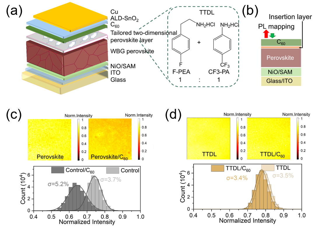 围绕电子传输层的优化,合作团队通过实验研究和理论模拟相结合,创新性的在顶部电子传输层界面引入4-氟苯乙胺(F-PEA)和4-三氟甲基苯胺(CF3-PA)的混合物,形成定制的二维钙钛矿层(TTDL,图1a)。这种设计在优化电子传输层界面均匀性(图1b-d)的同时,有效避免二维钙钛矿层带来的面外方向电子输运抑制。