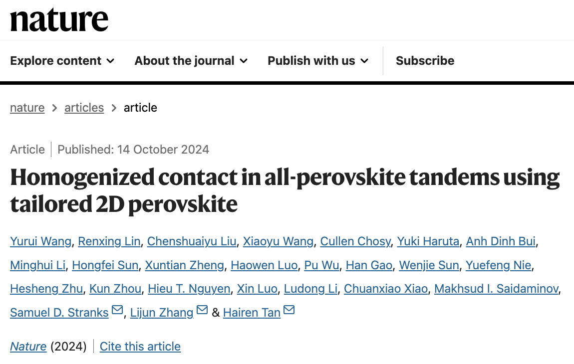 Nature | 张立军教授团队与合作者在钙钛矿太阳能电池的电子传输层界面优化设计方向取得新进展
