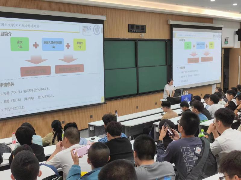 杨淞老师首先介绍了学院外事工作概况,并对近几年本科生参与国际交流和出国深造数据进行基本的梳理和分析,随后详细解读了“英国曼彻斯特大学本科生双学位2+2、2+3、3+2联合培养项目”、“新加坡国立大学本科生 “3+1+1”、“瑞典林雪平大学本科生3+1+1联合培养项目”、“德国亚琛工业大学4+2项目”等目前学院的国际交流合作项目,并对报名条件、选拔资格、费用、毕业去向等进行详细介绍,并细致耐心的回答了同学们提出的相关问题。