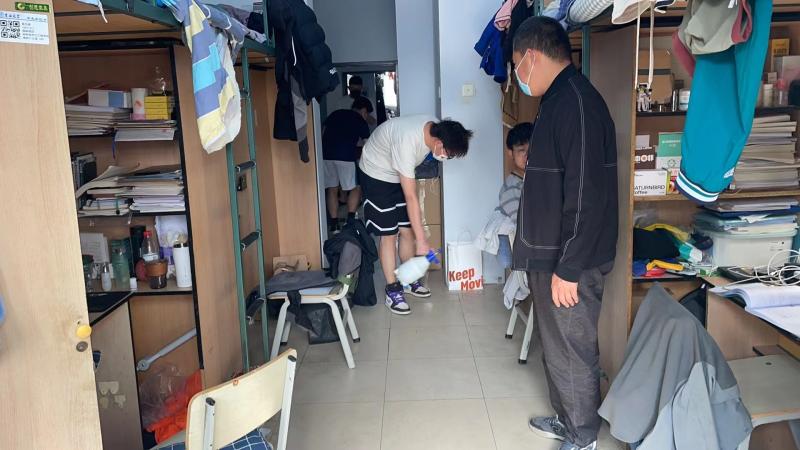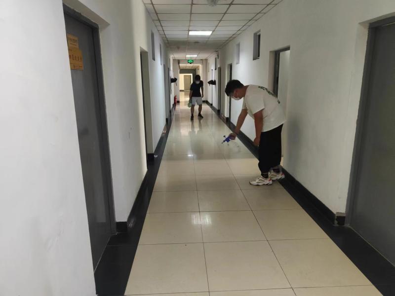 下午15:00时,学生党员志愿者在辅导员老师的带领下,来到十一公寓四楼男生寝室、十二公寓A区四楼女生寝室,对全年级寝室大清扫情况进行检查,并通过工作交流群进行检查情况的通报和沟通;同时,按照校医院老师的具体指导,开展预防性消杀工作。