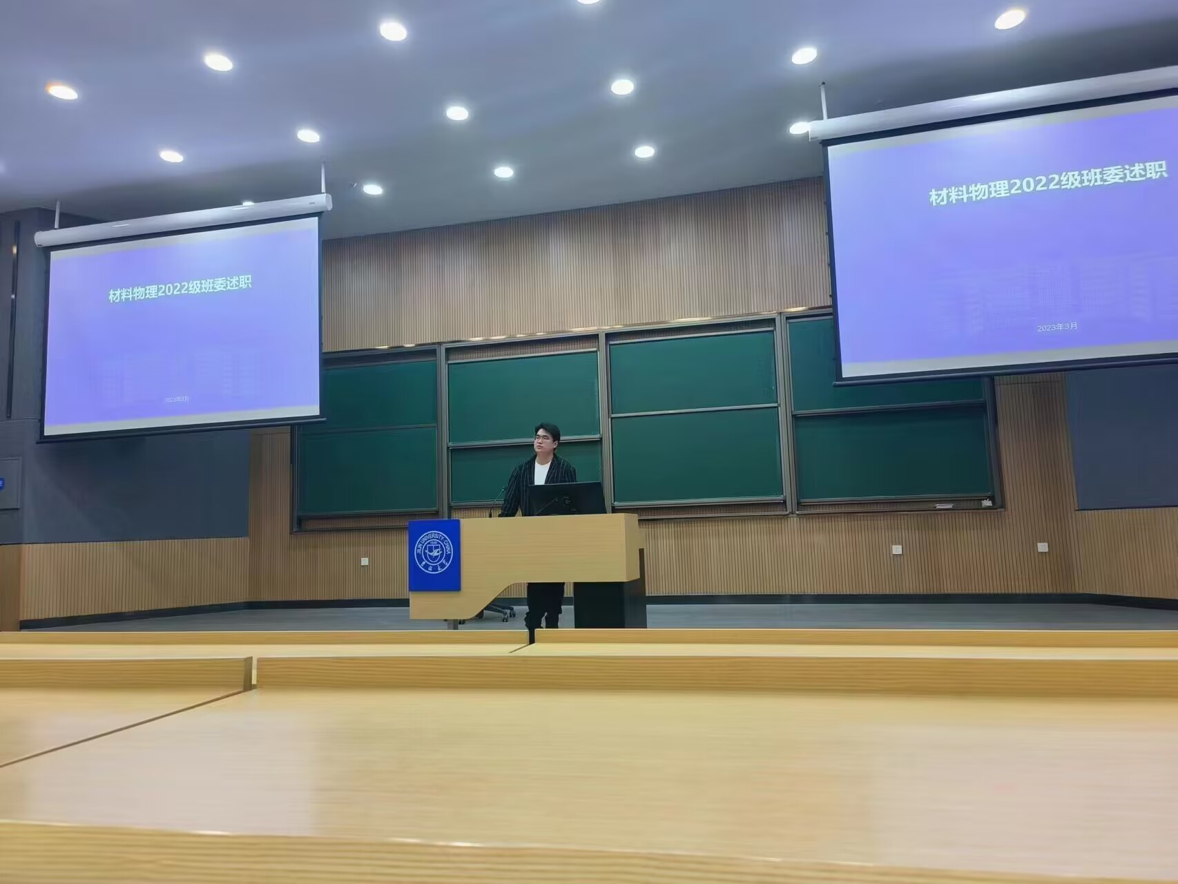 材料物理专业于2023年3月23日在逸夫教学楼第五阶梯教室开展了2022级班委述职大会。材料物理本科生辅导员张晗禹、2022级全体本科生参与此次会议。