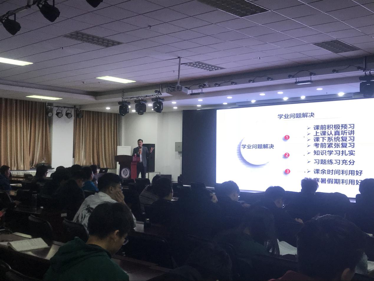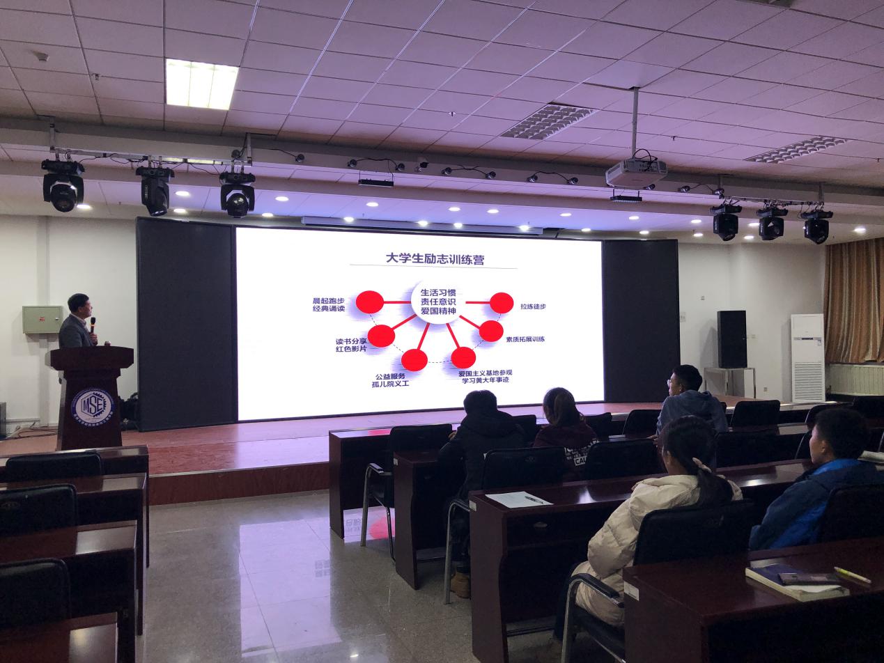 会议开始,由李东生老师上台致辞。李老师在致辞中明确指出部分大学生学业上存在的一系列问题,并就这些问题进行深刻剖析,详细阐述了其表面原因及深层次原因,突出强调本科学习期间学业的重要性和紧迫性。随后,李老师就学业上的一些问题提出了相关的解决措施,希望同学们能够“多实践”、“多体验”、“多承担”,逐步提高自身综合素质。同时,李老师也积极鼓励同学们在生活和学业上相互帮助、共同进步。最后,李老师向与会者详细介绍了励志训练营的主要活动内容,如晨起跑步、诵读经典文学、读书分享会、观看红色影片等系列活动。