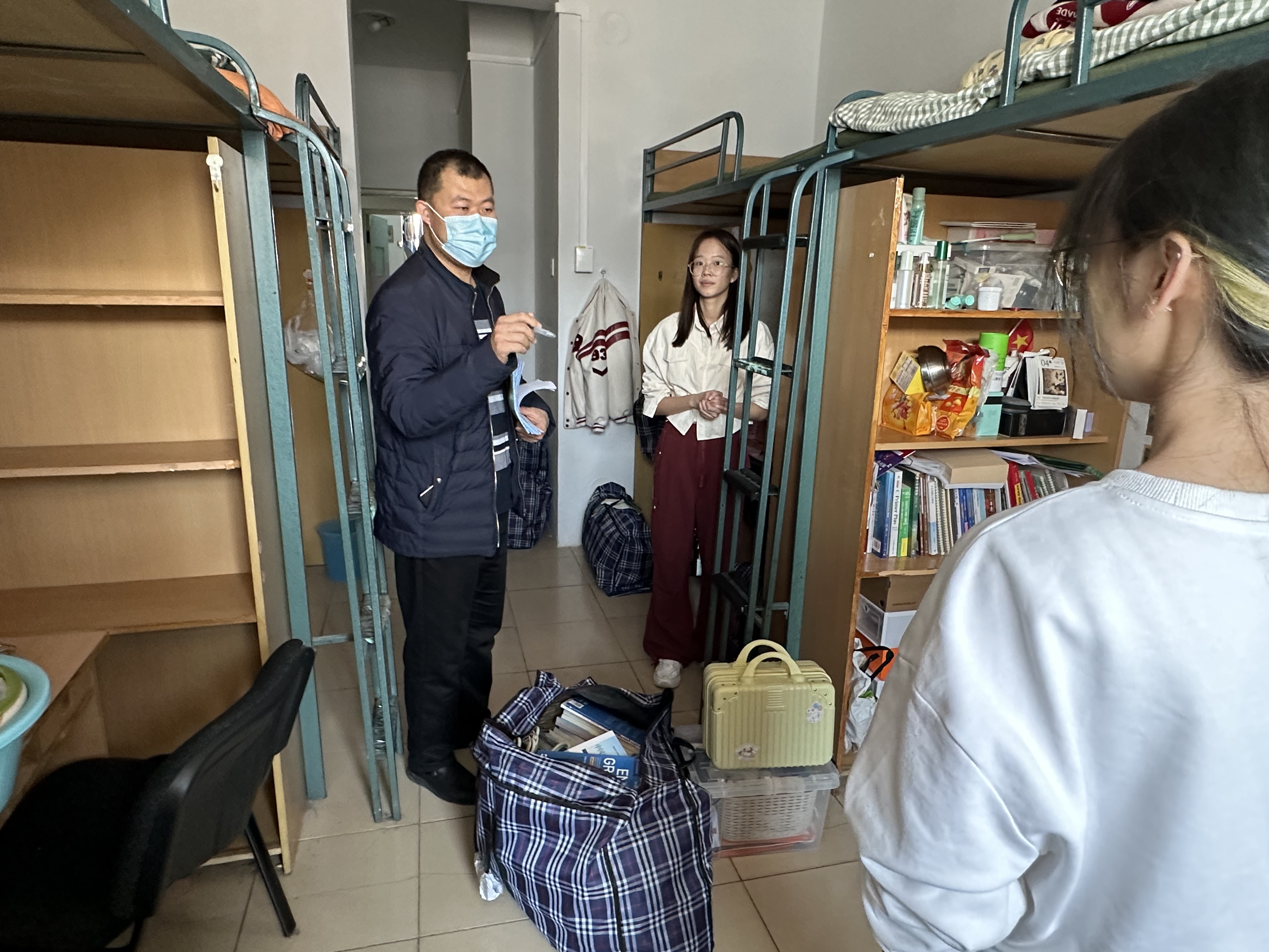 严老师早早地来到了学生寝室,逐一走访有人员变动的寝室,落实床位变动,帮助同学们更快完成自己的搬迁任务。